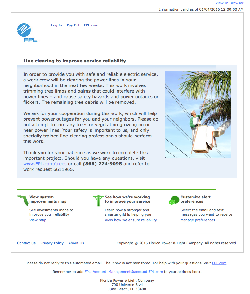 2) HOA’s *could* come to the aid of the community of responsible homeowners who have tried and failed to get FPL to keep the lines clear. It could be as simple as inspecting the neighborhood when they are checking out roof mold or whatever and culling a days worth of trimming to keep FPL’s costs down.