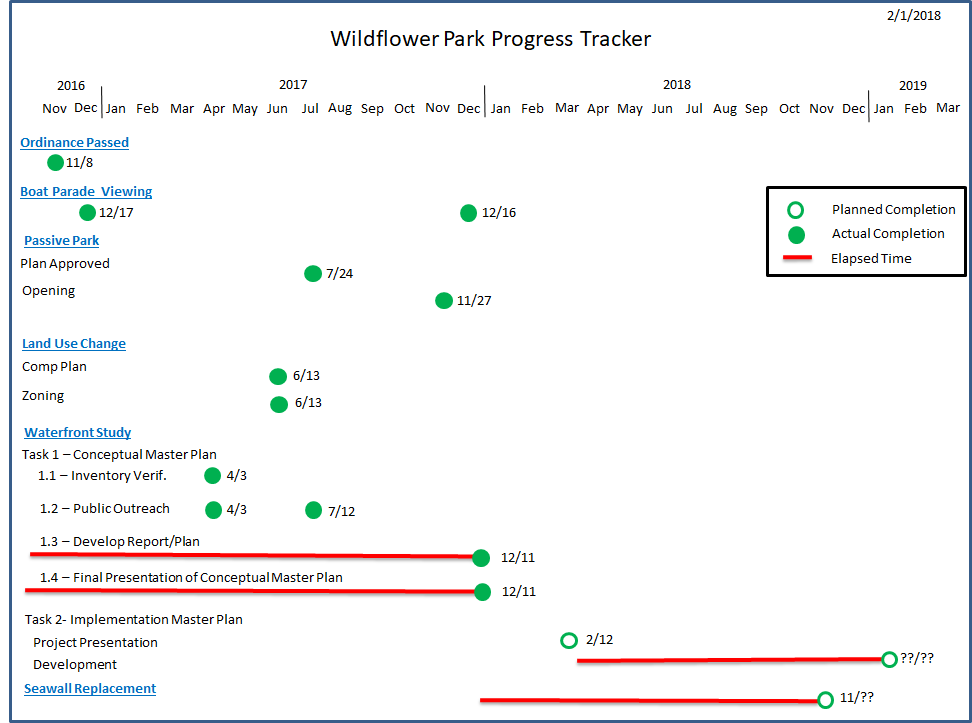 The City Council has decided that the development of Wildflower Park is the highest priority in the comprehensive waterfront study. As indicated in the progress tracker below, Task 1 – Conceptual Master Plan is now complete and the study is now focusing on Task 2 – Implementation Master Plan. EDSA is scheduled to present information on Task 2 at the February 12, 2017 City Council Workshop Meeting. Task 2 involves implementation details regarding construction, costs, schedules, etc. The City Council must then provide direction to City Staff on how to proceed on Task 2.