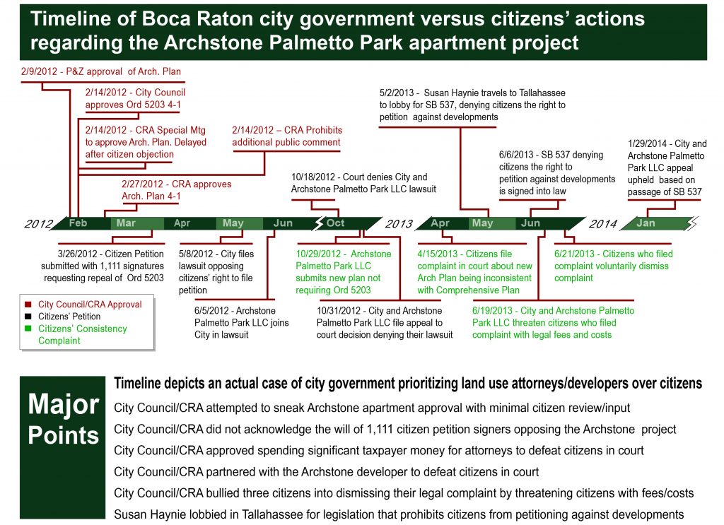 The Archstone Palmetto Park apartment project (now called Palmetto Promenade on East Palmetto Park Road) presented in 2012 is one example of this. Within five days, the Planning and Zoning board approved the proposal and then the City Council approved it. Hours after that City Council meeting, residents were finally able to voice their concerns at the Community Redevelopment Agency (CRA) meeting. They were able to slightly delay the process, but then the CRA prohibited any additional public comment during that meeting. Ultimately, it was approved less than two weeks later. How is this providing adequate time for the public to comment on a new, massive project? Following is a timeline of Archstone approval dates. Note the fast-tracking of approval milestones in the red text.