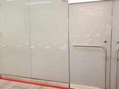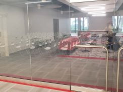 The gym is behind glass doors controlled by key card. The workout equipment, treadmills, universal systems and weights are brand new looking. This section of the corridor, along with the conference rooms, looks complete and perfect – there was no construction visible or any indication it was occurring.