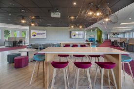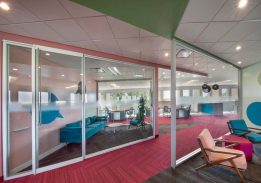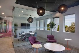 You could film a very convincing sci-fi scene in the room, have normally dressed actors sitting in the chairs and it would still be believable if you said the setting was 100 years into the future. The coolest part of the room was the variably opaque glass wall between the conference room and the lounge area. This gives the room’s users the ability to switch between see-through and non-see-through modes, making the room private with the flick of a switch if so desired.